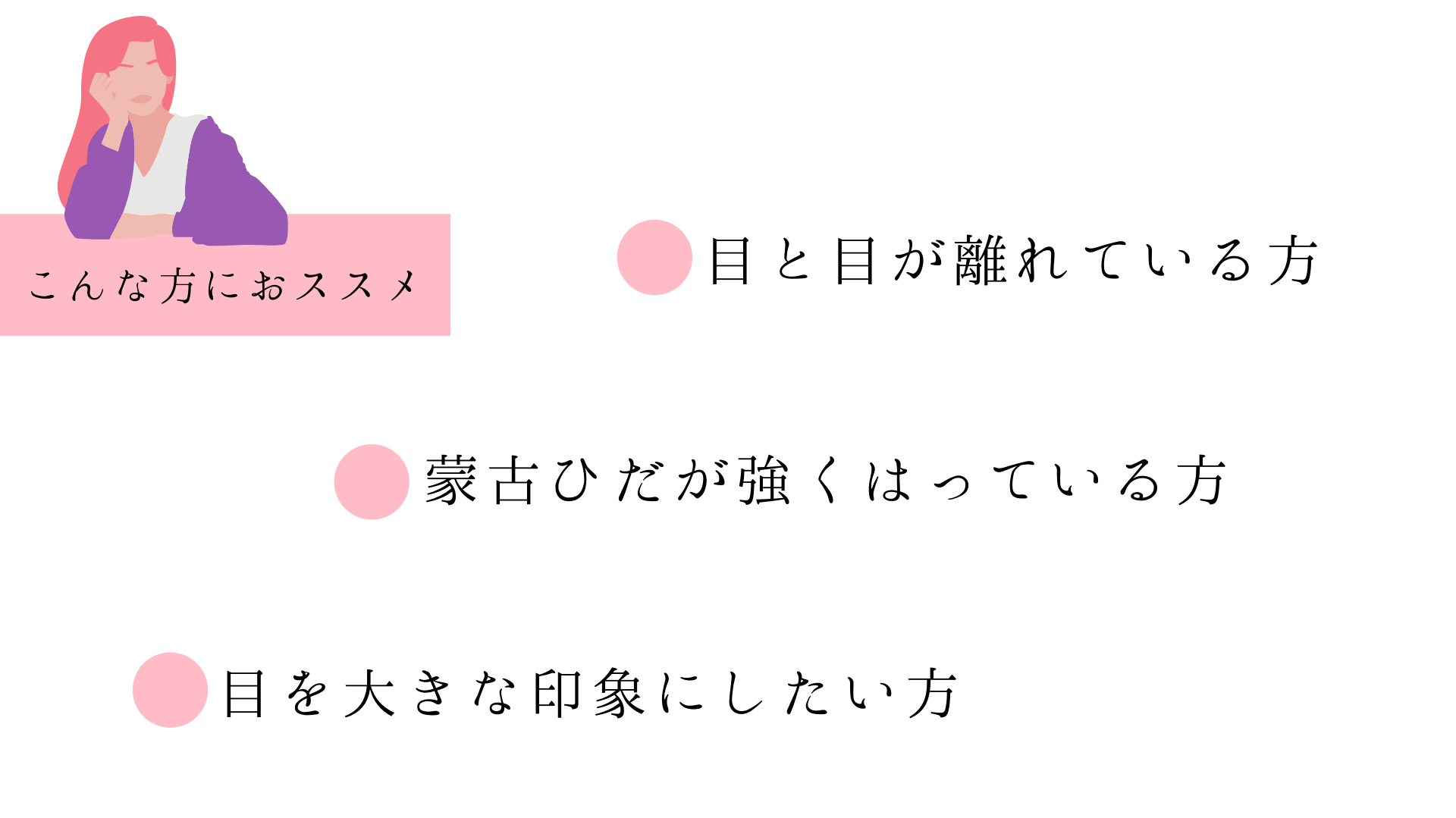 目尻に向かって広がる日本人的な二重というよりは、欧米人タイプの目に近くなります。二重の形は奥二重型、末広型、mix型、平行型の4つの型に分けられます。白人ではほとんどが平行型で目頭の部分にある涙丘という赤い部分が露出していますが、日本人ではこの部分に蒙古ヒダが存在するために末広型になる人が多いようです。ヒダの程度は、ほとんど無い人からかなりヒダが強い人まで色々です。末広型を平行型の二重にしたい、目の内側をもう少し大きく開けたい時は目頭切開法が適しています。