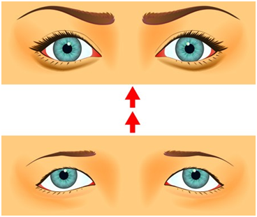 若いころすっきりとしていた目元も加齢とともにたるみが生じ、まぶたの皮膚が目の上におおいかぶさってきて、どんよりと重い感じの目元になってきます。このような方は、上まぶたのタルミ取りの手術がよい適応となります。上まぶたのタルミ取り手術を行うだけで明るく若々しいイメージになります。手術方法は、二重のライン上を切開し、たるんだ部分を切り取ります。タルミ取りをすると、眉毛の位置は下がりますので、若々しい印象になります。傷跡はしばらく赤みが残りますが、将来的には傷跡は白くなり目立たなくなります。5日後が抜糸となり、抜糸の翌日より洗顔、お化粧が可能となります。また眉毛を上げる額眉リフトや、こめかみリフトを併用すると効果的です。