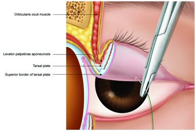 瞼板上端固定法は、瞼板固定法と挙筋固定法との中間の位置にあり、両者の利点を有しています。すなわち、瞼板上縁から皮膚側に走行する挙筋腱膜の流れに埋没糸の掛け方が合致し解剖学的に自然であること、挙筋固定法に比較して瞼板という支持組織に固定でき戻りにくい二重まぶたにするための工夫と考えられること、瞼板固定法に比較して糸がまぶたの裏側に露出せず角膜障害の危険性が全くないこと、瞼板上端前面は瞼板本体に比べ柔らかい組織であり手術操作が容易で余分な力が要らないこと、手術後の出血や腫脹が少なく早期の社会復帰が可能であること、ミュラー筋の開瞼調節に対して影響がほとんどなく一時的眼瞼下垂をきたしにくいこと、などが挙げられます。この方法は目にやさしい手術法なのです。
