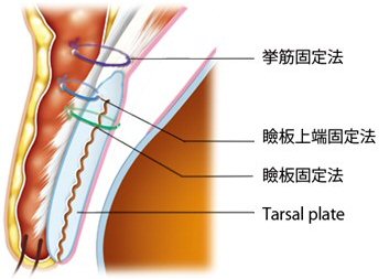 瞼板固定法の長所は、手術手技が単純、腫れが少ない、瞼板という支持組織を利用するので強く糸を結んでも常に同じような成果が得やすいことなどです。