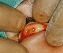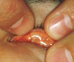 瞼板面に糸が露出して慢性炎症を起こしています。